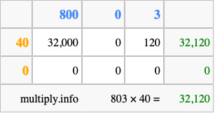 That's all there is to it! As you can see from the box above, the answer to 803 times 40 using the box method is 32,120.