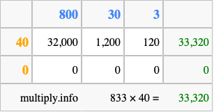 That's all there is to it! As you can see from the box above, the answer to 833 times 40 using the box method is 33,320.