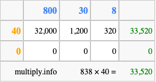That's all there is to it! As you can see from the box above, the answer to 838 times 40 using the box method is 33,520.