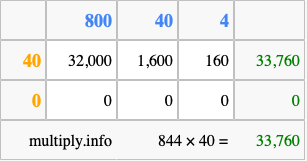 That's all there is to it! As you can see from the box above, the answer to 844 times 40 using the box method is 33,760.