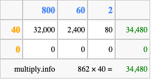 That's all there is to it! As you can see from the box above, the answer to 862 times 40 using the box method is 34,480.