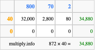 That's all there is to it! As you can see from the box above, the answer to 872 times 40 using the box method is 34,880.