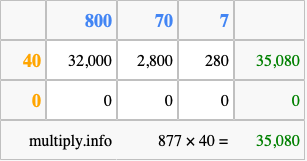 That's all there is to it! As you can see from the box above, the answer to 877 times 40 using the box method is 35,080.