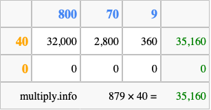 Finally, we add up all the sums we found in step 3 to get our final answer to 879 times 40.