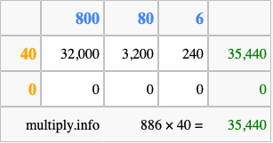 That's all there is to it! As you can see from the box above, the answer to 886 times 40 using the box method is 35,440.