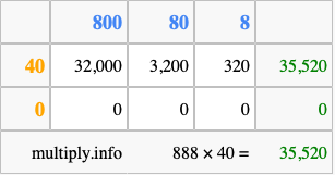Below is an illustration showing you how to calculate 888 times 40 using the box method, using the instructions above.