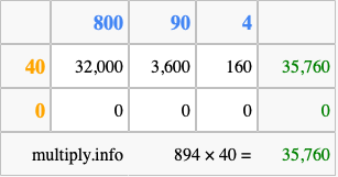 That's all there is to it! As you can see from the box above, the answer to 894 times 40 using the box method is 35,760.