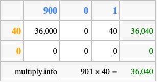 Below is an illustration showing you how to calculate 901 times 40 using the box method, using the instructions above.