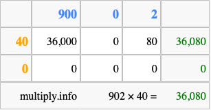 That's all there is to it! As you can see from the box above, the answer to 902 times 40 using the box method is 36,080.