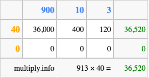 Finally, we add up all the sums we found in step 3 to get our final answer to 913 times 40.