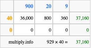 Below is an illustration showing you how to calculate 929 times 40 using the box method, using the instructions above.