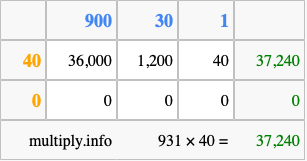 That's all there is to it! As you can see from the box above, the answer to 931 times 40 using the box method is 37,240.