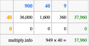 Below is an illustration showing you how to calculate 949 times 40 using the box method, using the instructions above.