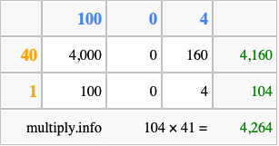 That's all there is to it! As you can see from the box above, the answer to 104 times 41 using the box method is 4,264.