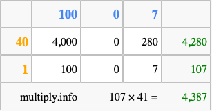 Finally, we add up all the sums we found in step 3 to get our final answer to 107 times 41.