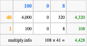 Finally, we add up all the sums we found in step 3 to get our final answer to 108 times 41.