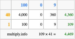 Finally, we add up all the sums we found in step 3 to get our final answer to 109 times 41.