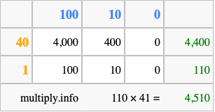 That's all there is to it! As you can see from the box above, the answer to 110 times 41 using the box method is 4,510.