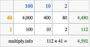Finally, we add up all the sums we found in step 3 to get our final answer to 112 times 41.