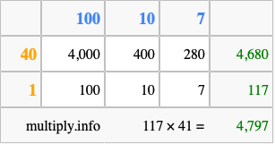 Finally, we add up all the sums we found in step 3 to get our final answer to 117 times 41.