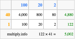 That's all there is to it! As you can see from the box above, the answer to 122 times 41 using the box method is 5,002.