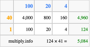 Finally, we add up all the sums we found in step 3 to get our final answer to 124 times 41.