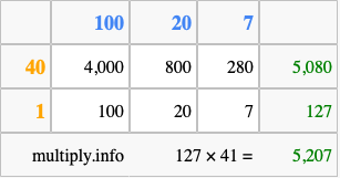 Below is an illustration showing you how to calculate 127 times 41 using the box method, using the instructions above.