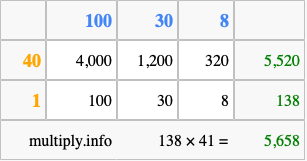 Finally, we add up all the sums we found in step 3 to get our final answer to 138 times 41.