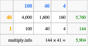 Finally, we add up all the sums we found in step 3 to get our final answer to 144 times 41.