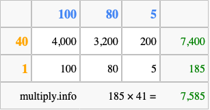 Finally, we add up all the sums we found in step 3 to get our final answer to 185 times 41.