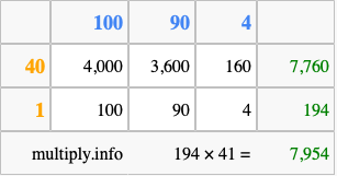 Finally, we add up all the sums we found in step 3 to get our final answer to 194 times 41.