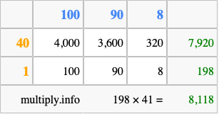 Finally, we add up all the sums we found in step 3 to get our final answer to 198 times 41.