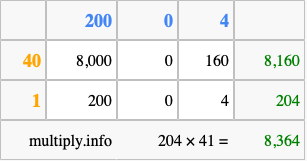 Finally, we add up all the sums we found in step 3 to get our final answer to 204 times 41.