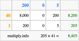 Finally, we add up all the sums we found in step 3 to get our final answer to 205 times 41.