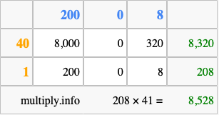 That's all there is to it! As you can see from the box above, the answer to 208 times 41 using the box method is 8,528.
