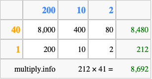 That's all there is to it! As you can see from the box above, the answer to 212 times 41 using the box method is 8,692.
