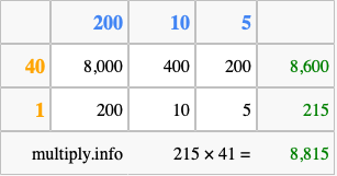 Below is an illustration showing you how to calculate 215 times 41 using the box method, using the instructions above.