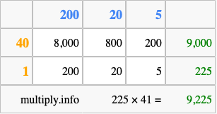 Finally, we add up all the sums we found in step 3 to get our final answer to 225 times 41.