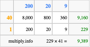 That's all there is to it! As you can see from the box above, the answer to 229 times 41 using the box method is 9,389.