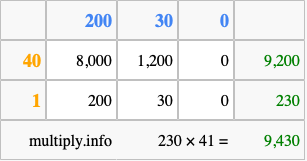 That's all there is to it! As you can see from the box above, the answer to 230 times 41 using the box method is 9,430.
