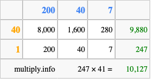 Finally, we add up all the sums we found in step 3 to get our final answer to 247 times 41.