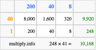 Below is an illustration showing you how to calculate 248 times 41 using the box method, using the instructions above.