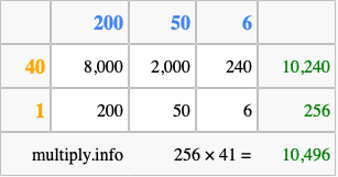 That's all there is to it! As you can see from the box above, the answer to 256 times 41 using the box method is 10,496.