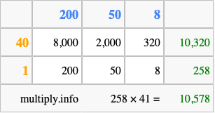 That's all there is to it! As you can see from the box above, the answer to 258 times 41 using the box method is 10,578.