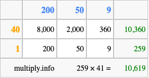 Finally, we add up all the sums we found in step 3 to get our final answer to 259 times 41.