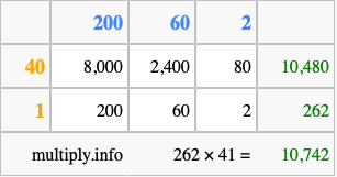 That's all there is to it! As you can see from the box above, the answer to 262 times 41 using the box method is 10,742.