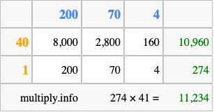 Finally, we add up all the sums we found in step 3 to get our final answer to 274 times 41.
