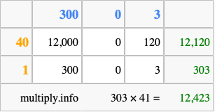 Finally, we add up all the sums we found in step 3 to get our final answer to 303 times 41.