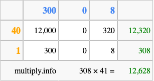 Below is an illustration showing you how to calculate 308 times 41 using the box method, using the instructions above.