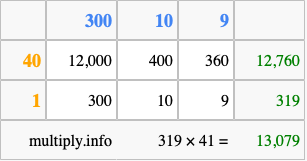 Finally, we add up all the sums we found in step 3 to get our final answer to 319 times 41.